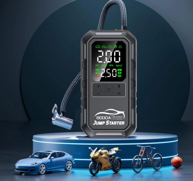 בוסטר התנעה עוצמתי לרכב עם קומפרסור מובנה, מטען USB ותאורת LED – הכל במכשיר אחד קומפקטי ונוח לשימוש.